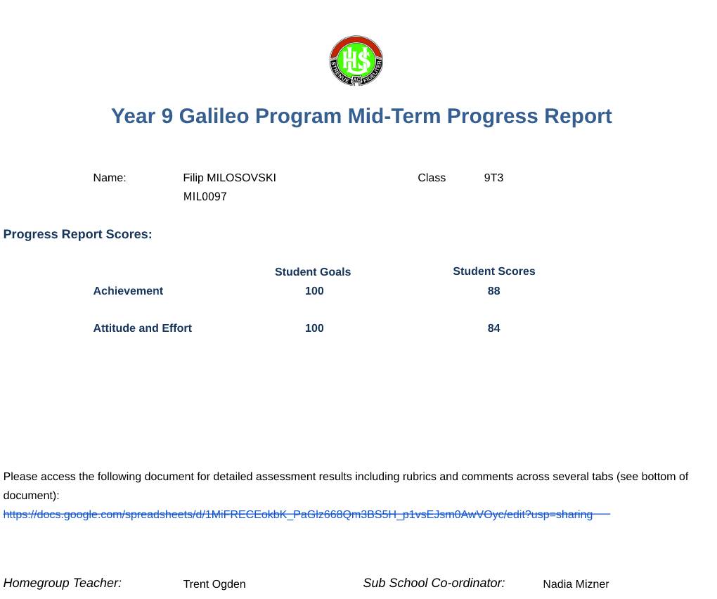 Year 9, School Report – Galileo Program