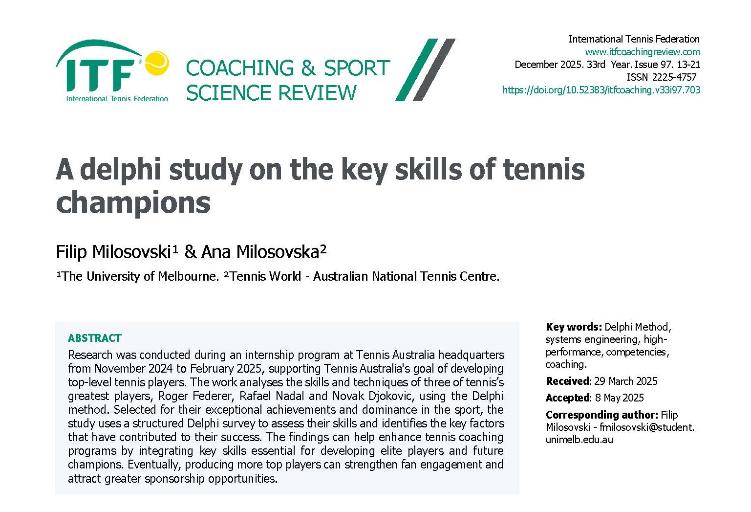 Milosovski, F., & Milosovska, A. (2025). A Delphi study on the key skills of tennis champions. ITF Journal: Coaching & Sport Science Review, 33(97), 13–21.